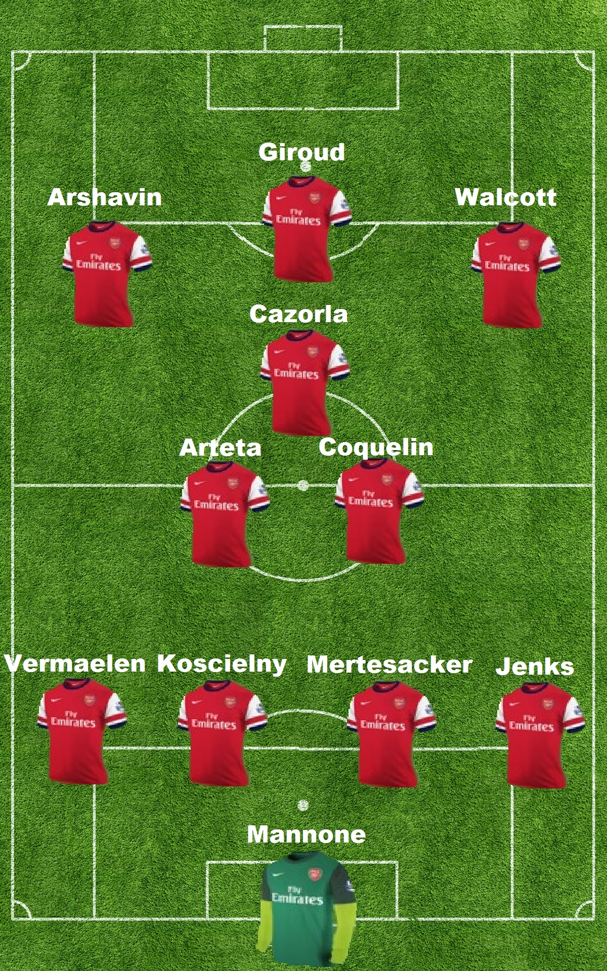 Mannone, Sagna, Koscielny, Mertesacker, Vermaelen, Coquelin, Arteta, Cazorla, Walcott, Podolski, Giroud.