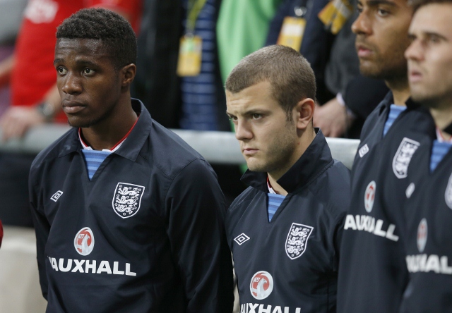 England’s Wilfried Zaha (L) stands with team-mates before their international friendly soccer match against Sweden at the Friends Arena in Stockholm November 14, 2012. REUTERS/Phil Noble (SWEDEN – Tags: SPORT SOCCER)