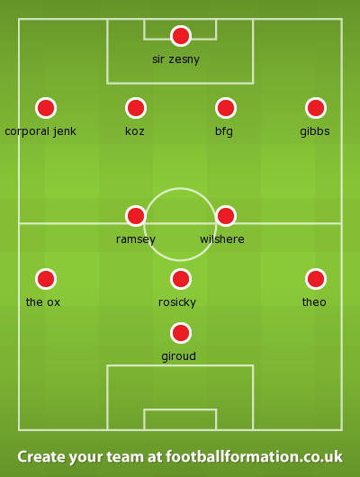 Szczesny, Jenkinson, Mertesacker, Koscielny, Santos, Diaby, Ramsey, Rosicky, Oxlade-Chamberlain, Podolski, Giroud