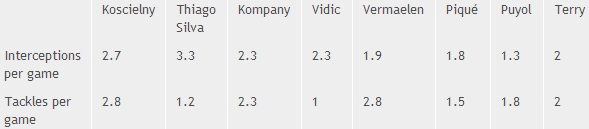 Key Stat: Last season: Koscielny finished second in the league for aerial duels won (only 2% behind the monster Samba, 6% more than Cahill, and 14% more than Vermaelen). Have a look at his tackle and interception stats: