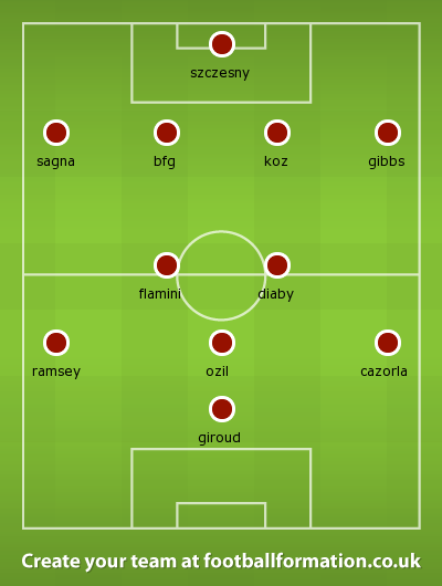 If you take my line up as a starting point, but with a more realistic view of it happening, then perhaps Ramsey for Diaby would be my only change. The pace of Walcott and Rosicky down the right, and Sagna not far away, and Ozil and Gibbs combining on the other, leaving the Diaby(if only)/Ramsey to power into gaps down the middle, and all combinations supporting Giro up front. That would be one to take on any team at the present time?