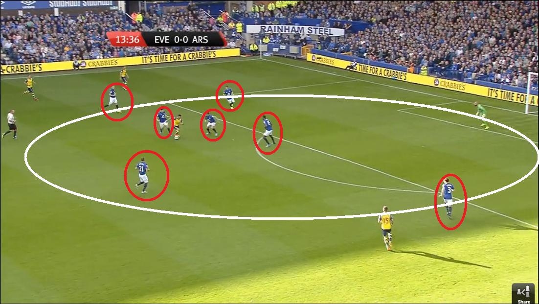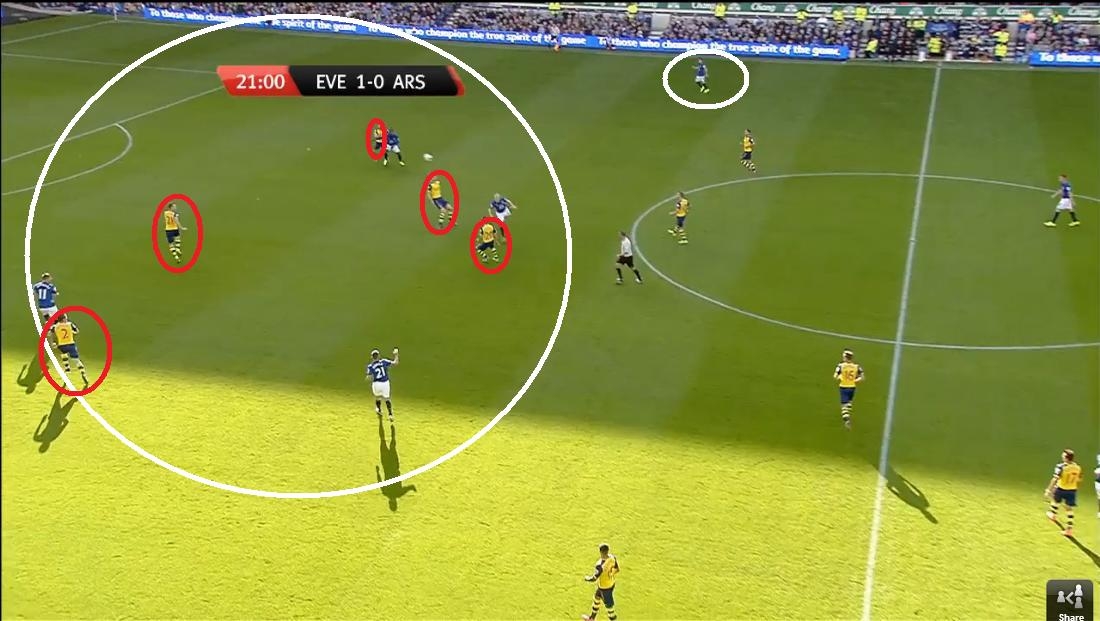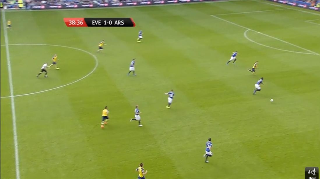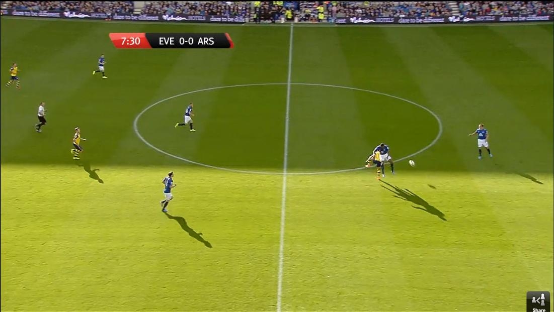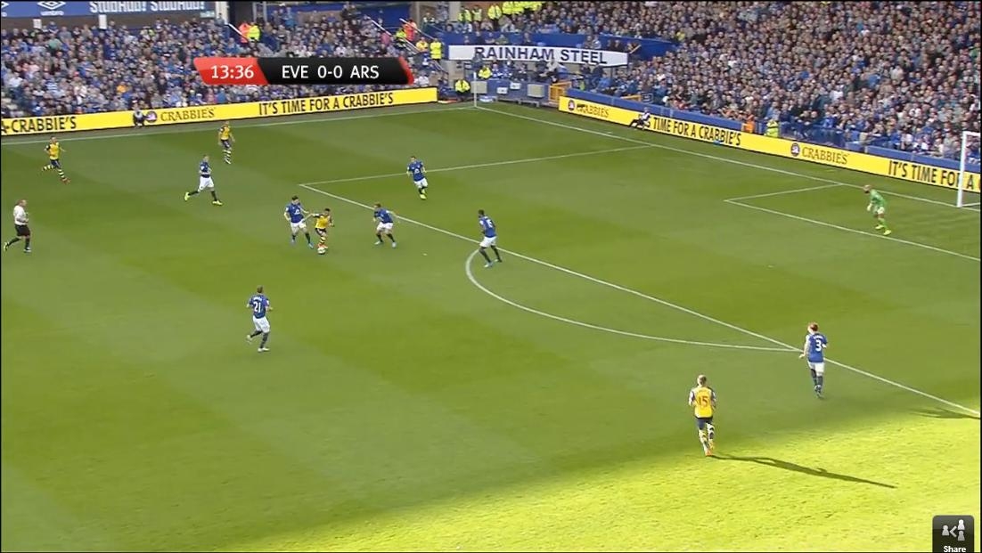 So from before, here Everton have a four on five attack with the extra midfielder still out wide for support further ahead than any of our covering midfielders. Some may say that in the diamond system with Sanchez as the pivot (as I have it outlined in my arsenal example) he would never win that header but what if it was Giroud feeding Walcott and Campbell? The options are there and it allows for each player to play more of their own game instead of being cramped together with four or five other players all playing the same game as them.