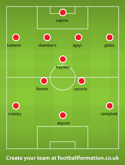 Rosicky deserves a start in his favoured right side, Campbell on the left, but expect a lot of movement between these three. Akpom up front because ….err, there isn’t anybody else? Nah, not even Poldi as CF.