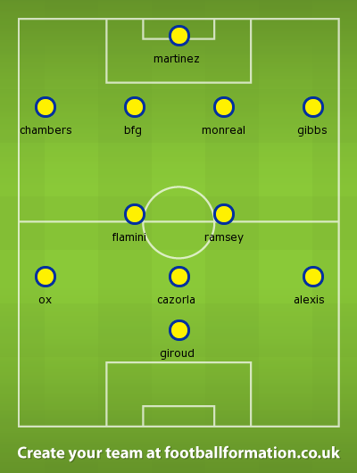 Arsenal: Martinez, Chambers, Mertesacker, Koscielny, Monreal, Flamini, Ramsey, Welbeck, Alexis, Cazorla, Giroud