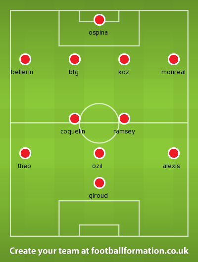 Ospina; Bel, Gab, Koq, Monreal- Coq and Carzola;-Sanchez, Ozil and Walcot- Giroud! ( R7 remains our best sub impact player!)
