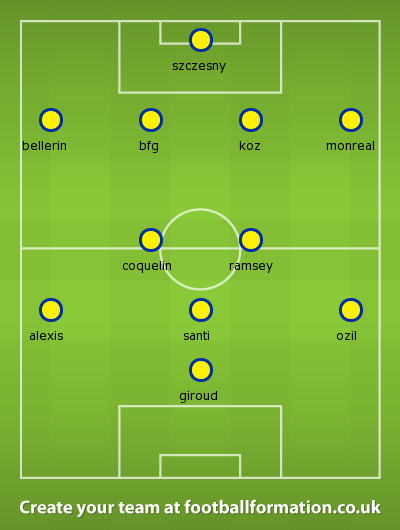 Can’t see your line up being too different either, i would have Gibbs at LB, Cazorla in Ramsey’s spot, Ozil in the middle where you have Santi and Theo and Sanchez on the wing – so only three changes from yours but what the boss will do is anyone’s guess.