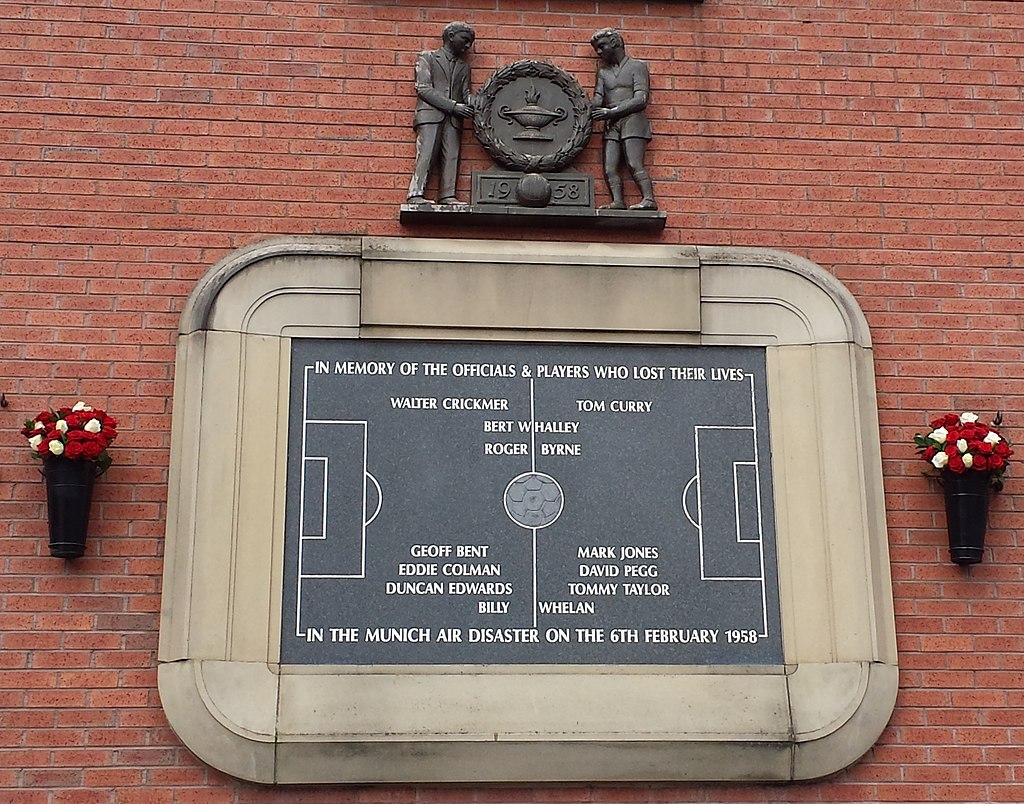 A plaque at Old Trafford in memory of those who died in the Munich air disaster, including players’ names.