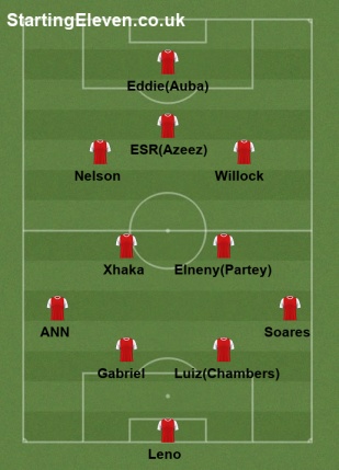 Rúnarsson, Cedric, Chambers, Luis, AMN, Elneny, Partey, Pepe, Willian, Martinelli and Nketiah/Auba. We should see Ceballos, ESR and/or Auba/Balogun come on later, assuming we don’t have any defensive injuries.