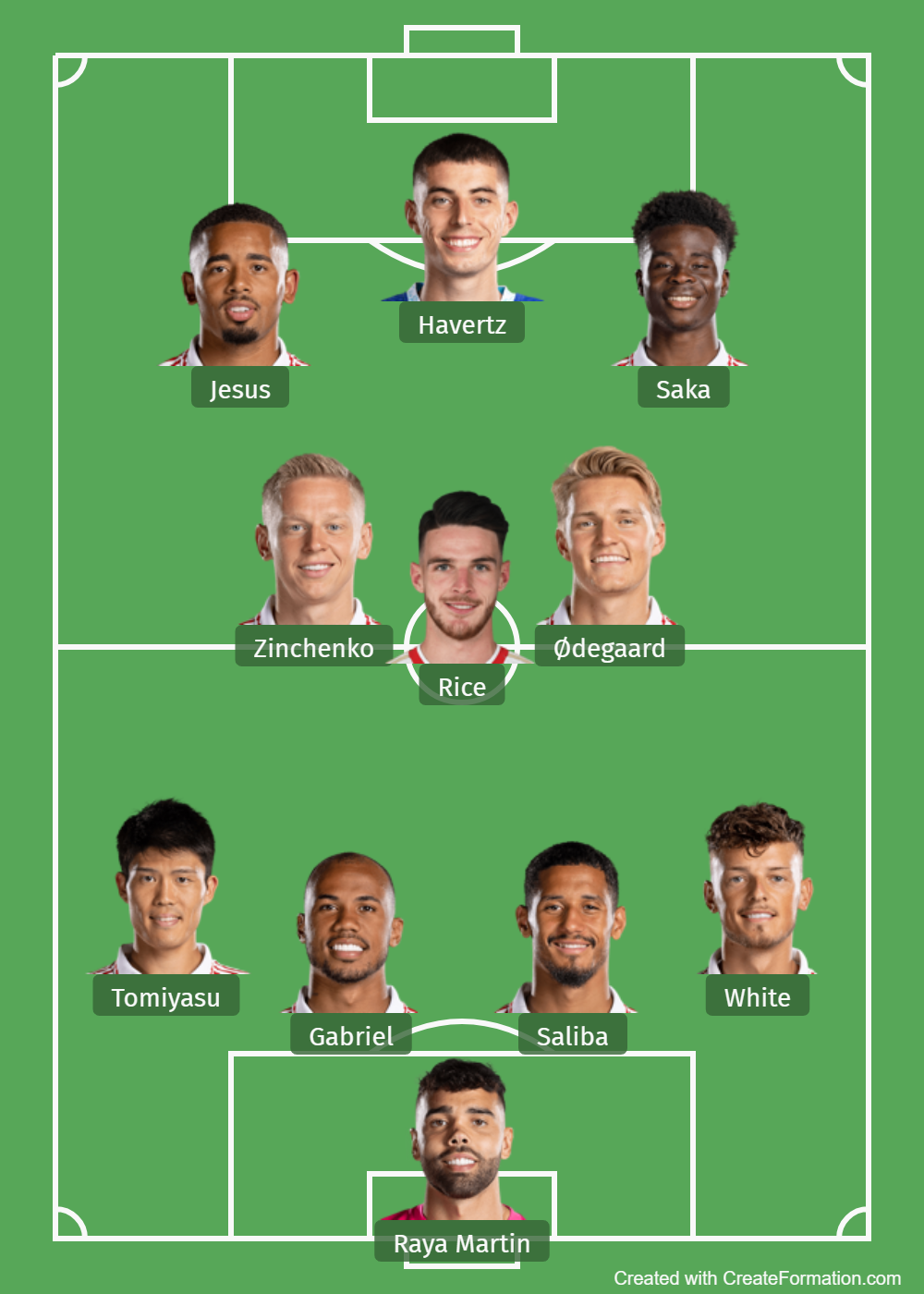 Arsenal XI: Ramsdale; White, Saliba, Gabriel, Kiwior; Rice, Odegaard, Jorginho; Saka, Nelson, Havertz