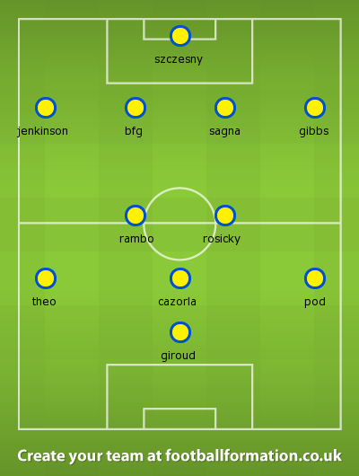 I expect Jack to play in the hole from the start and Myachi and Theo (or Gnabry) on the wing, and Giroud will probably not start this time round, so I am going for the Pod as our striker. The latter needs a good game and I have a feeling Wenger will give him the striker position tomorrow.