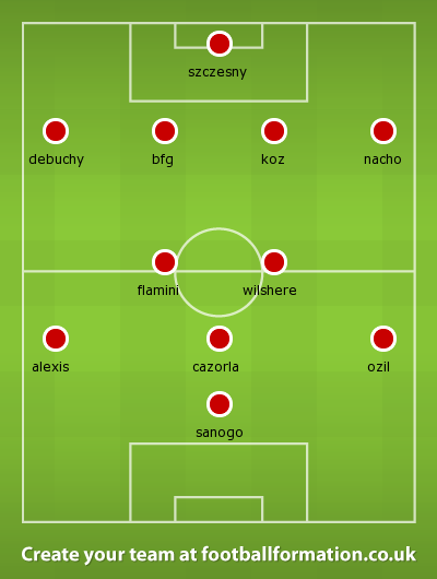 Arsenal: Jack (ankle), Arteta (calf), Welsh Jesus (hamstring), Flamini (groin – doubt), Ozil (knee – doubt. I think he’ll be on the bench for this one. If things are going well he might get a little run out), Welbeck (thigh – doubt), Giroud (suspended – last match), Sanogo (hamstring/going on loan – doubt), Podolski (groin strain/going to Inter), Diaby (calf strain/figment of our imagination).