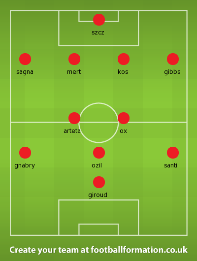 Ramsey continues to be out with mysterious issues. Walcott is still out for the season with his ACL issue. Wilshere will miss the game with a knock and Flamini is suspended from a fairly boneheaded tackle last game.