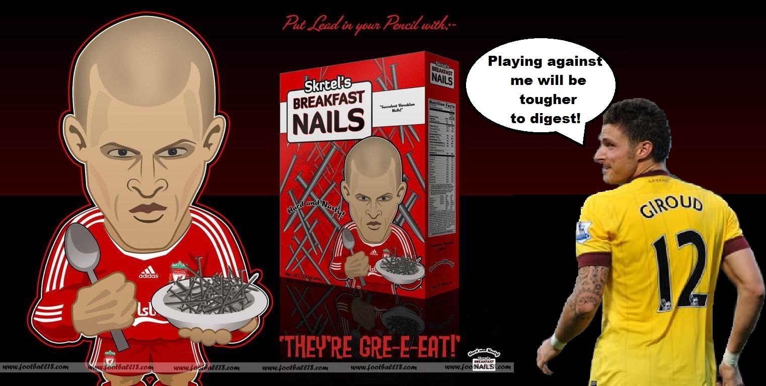 Giroud is in red hot form at the moment coming off of consecutive braces against Brighton and West Ham. Standing in his way for this game is the uncompromising Slovakian Martin Škrtel. Škrtel plays exactly how he looks…tough and ugly as sin. Both are powerful footballers who should enjoy the physical battle with one another. If Giroud continues his momentum, we will go a long way to winning this encounter. If Škrtel locks down on Giroud with help from Agger we may need to find another avenue to goal. The good thing about Giroud though is his desire to fight on, it may not go his way but he will keep battling until the final whistle. He can just as easily turn provider for either Podolski or Walcott.